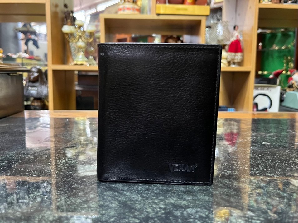 Siyah, deseniz düz ve VEKAR markalı erkek deri cüzdan, klasik biker tarzında ve iş kullanımına uygun.