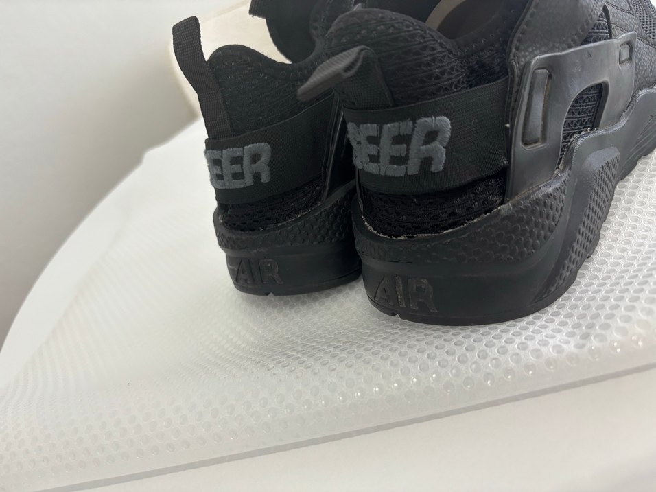 Siyah, dolgu topuklu erkek spor ayakkabısı, cırt cırtlı bantlı ve baskılı desenlidir. Rock punk tarzına uygun spor sokak stilini yansıtır.