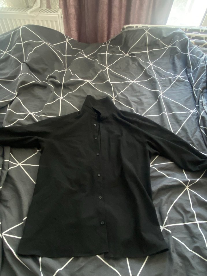 Siyah renkte, düğmeli, uzun kollu ve yaka detaylı erkek gömleği. Normal midi boyda, rahat kesim ve sentetik dokulu kumaştan yapılmıştır.