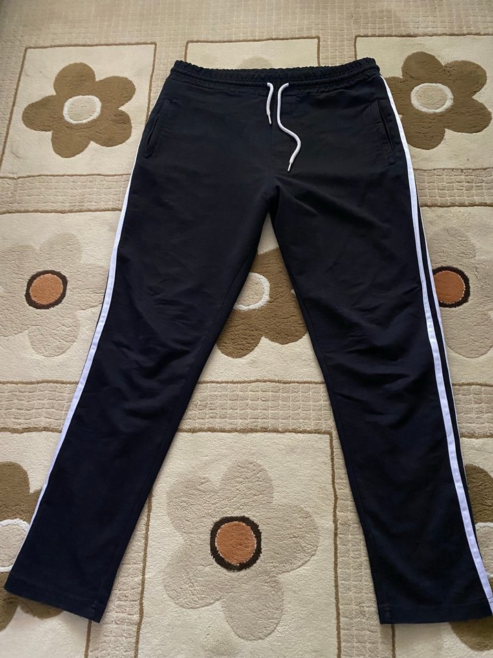 Siyah, regular fit ve normal boyda erkek spor eşofman . Beyaz yan şeritler ve kemerli bel tasarımı bulunur. spor ve günlük kullanıma uygundur.Sadece arka kısmında dikişinde sökülme var ama kullanmaya engel değil