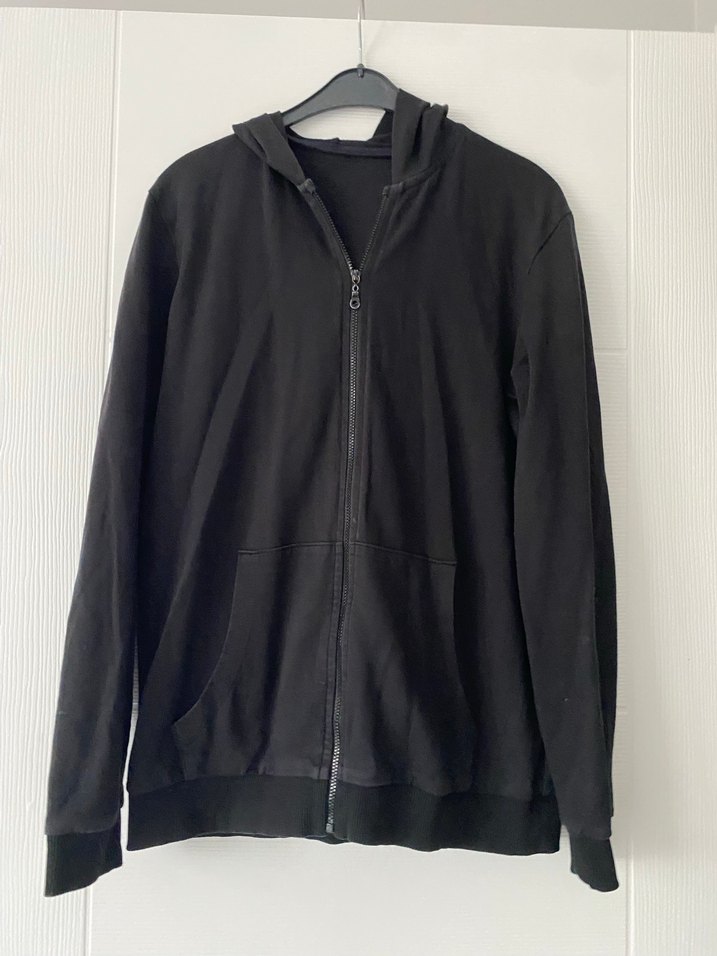Siyah renk, fermuarlı, uzun kollu, bol kesim erkek sweatshirt. Yuvarlak yaka ve yumuşak kumaş ile günlük kullanım için uygundur.