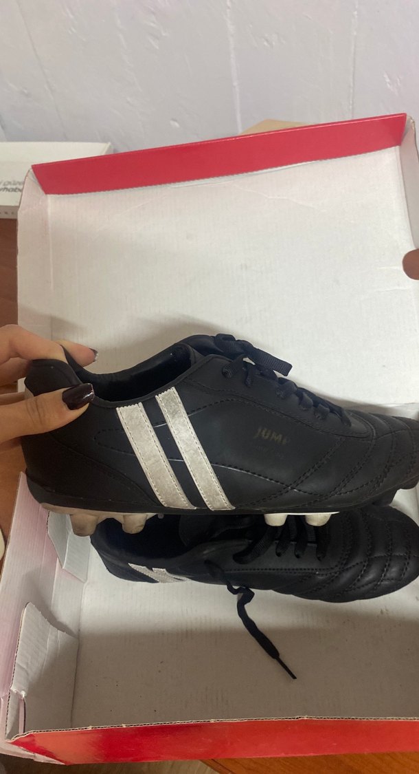 Bağcıklı siyah erkek futbol ayakkabısı, beyaz yan çizgilerle. Kauçuk tabanlı, spor ve sokak tarzı için uygun, desensiz tasarım. ⚽️
