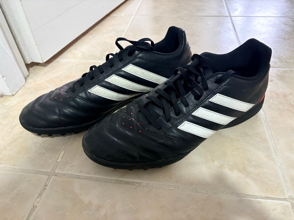 Bağcıklı siyah erkek futbol ayakkabısı, kauçuk tabanlı, sportif ve gündelik kullanım için uygundur. Beyaz çizgili sade koyu renk tasarıma sahiptir. Sadece 2 kez giyildi. ⚽ Orjinaldir.