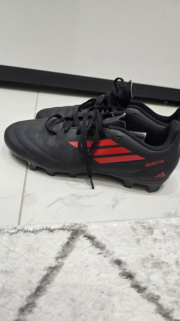 Koyu siyah renkli, kırmızı baskılı detaylara sahip erkek futbol ayakkabısı. Velcro ve kauçuk tabanlı, trend sokak stiline uygun. ⚽çok yeniiii sıfırdan farksız