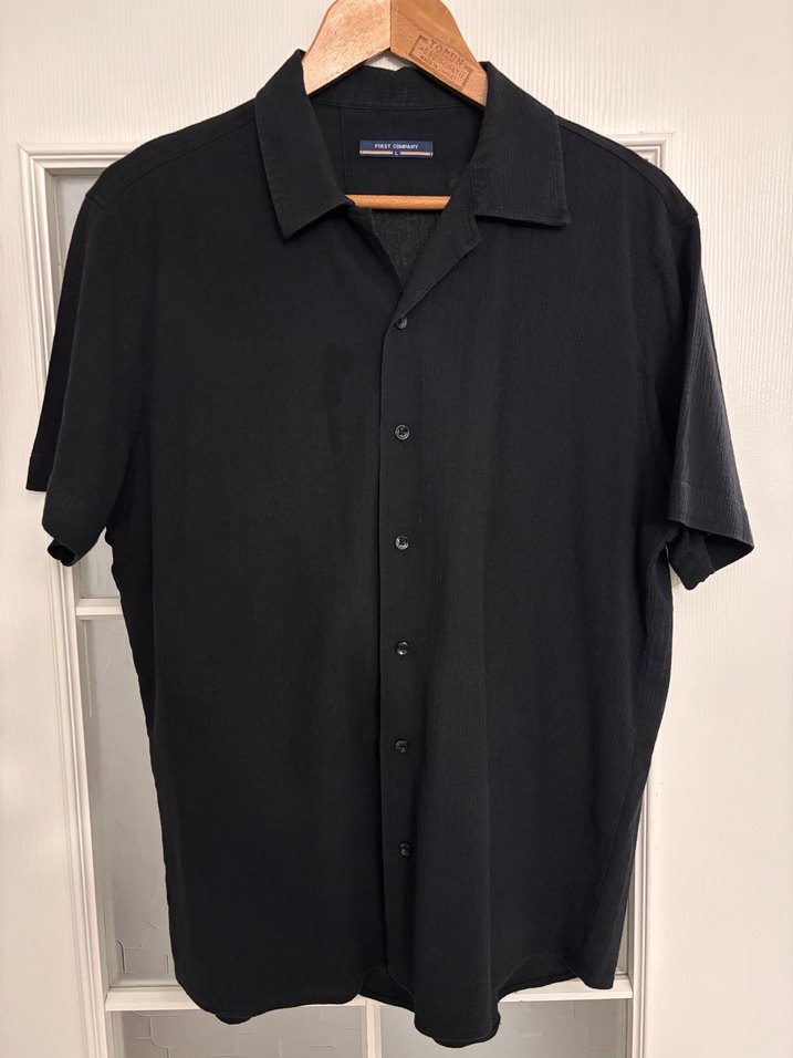 Siyah renkte, pamuklu kumaştan yapılmış kısa kollu, düğmeli ve yakalı erkek gömleği. Ön tarafta bir lekesi var ilk fotoğrafta belli olmaktadır. Rengi biraz solmuştur. Alacak kişi bunu bilerek almalı. Genişlik 56 cm, boy 75 cm’dir.