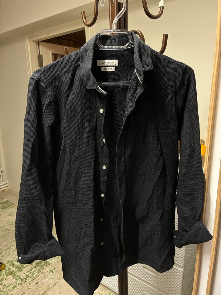 Slim fit Siyah gömlek, düğmeli ve notched lapel yakaya sahiptir. Uzun kollu, normal midi boy. Rahat sokak stili için uygundur.