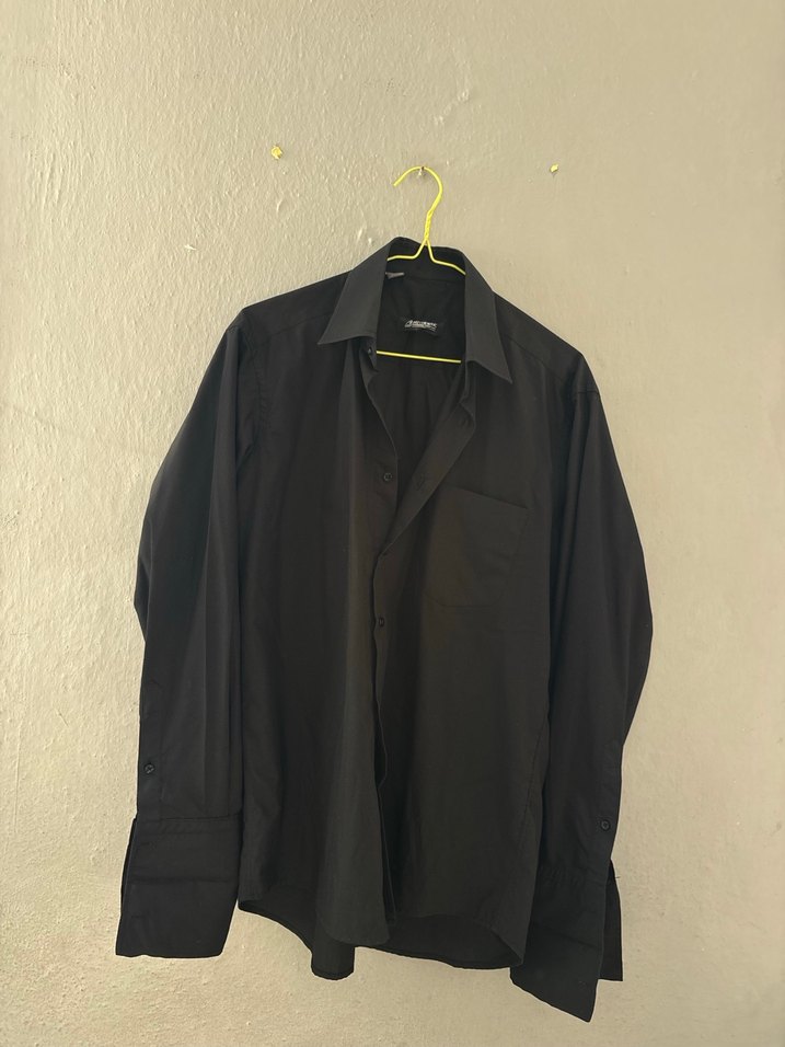 Siyah erkek gömlek, düğmeli ve uzun kolludur. Normal kesimi ve yakasıyla ofis için uygun, minimalist sokak stiline uyum sağlar.