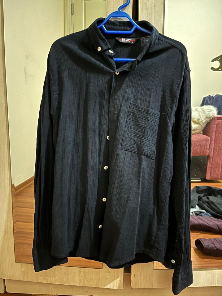 Siyah renkli uzun kollu, düğmeli ve yakası kesik detaylı erkek gömleği. Rahat kesimi ve cep detayıyla günlük kullanıma uygun.