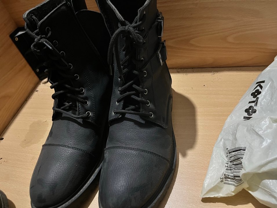 Koyu siyah erkek botları, bağcıklı ve tokalı detaylarla günlük kullanım için uygun goth tarzı. 42 numara