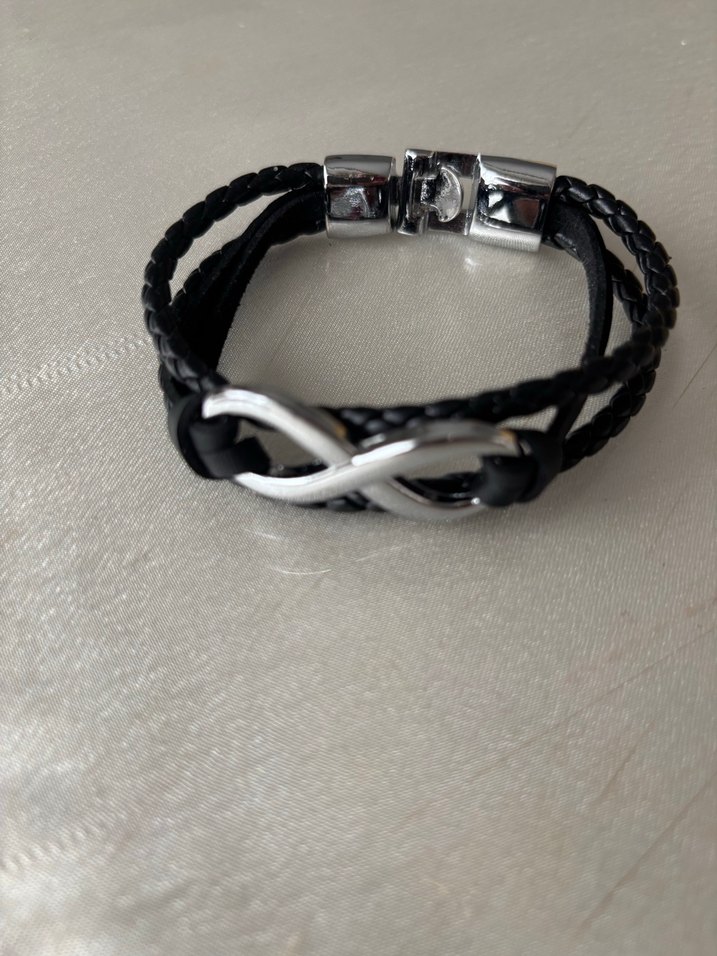 Siyah renkte, gotik tarzda erkek bileklik. Minimalist sonsuzluk sembollü, örgülü tasarıma ve metalik kilit mekanizmasına sahip.