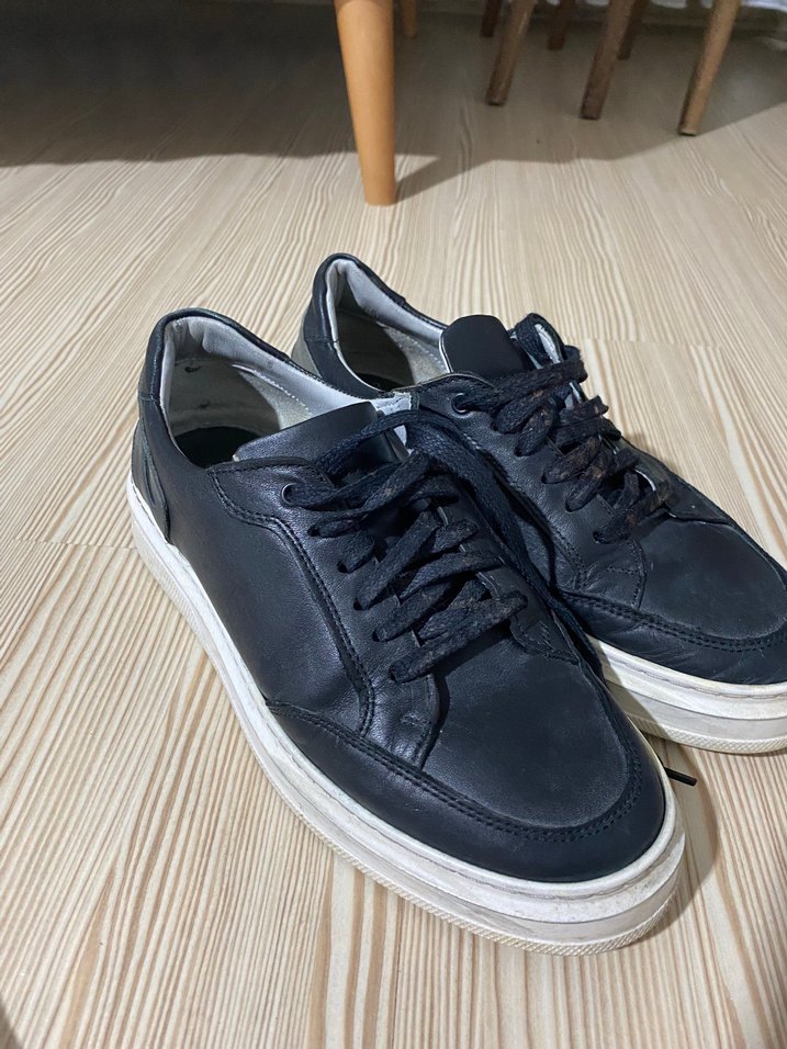 Siyah renkli, koyu kauçuk tabanlı erkek spor ayakkabısı. Sokak stili ve günlük kullanım için uygun, zahmetsiz şıklık sunar.