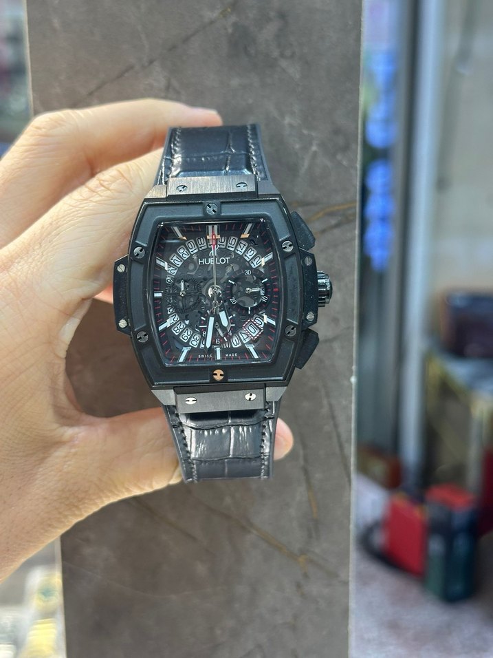 İş stiline uygun, detaylı kadranlı ve dokulu kayışlı siyah erkek Hublot saat. ⌚