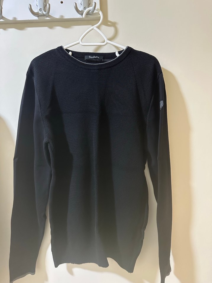 Siyah renkli, bisiklet yaka ve uzun kollu, ince triko kumaştan yapılmış, minimalist sokak stiliyle günlük kullanıma uygun erkek kazak.