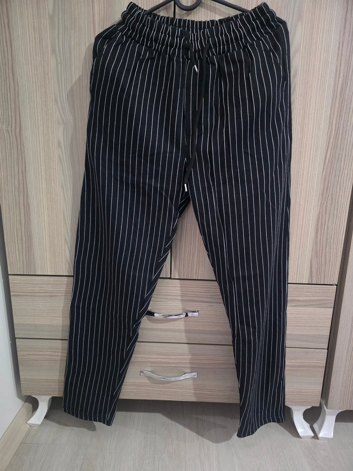 Siyah çizgili erkek pantolon, pilili ve normal boyda, regular fit ile günlük kullanıma uygundur. Elastik bel detaylı, pamuk kumaştan üretilmiştir. hiç kullanılmamış olup etiketi mevcut değildir.