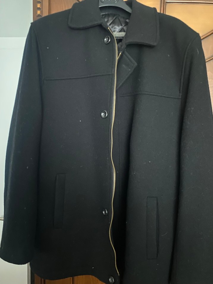 Düğmeli, siyah erkek kaban; klasik yakalı, uzun kollu ve midi boydadır. Ofis için uygun, yumuşak ve sıcak kumaştan üretilmiştir.