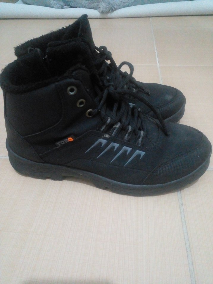 Siyah kauçuk malzemeden erkek botları, Velcro ve bağcıklı tasarıma sahip, içi sıcak tutan astarlı. Sokak stili ve dış mekan kullanımı için uygundur.