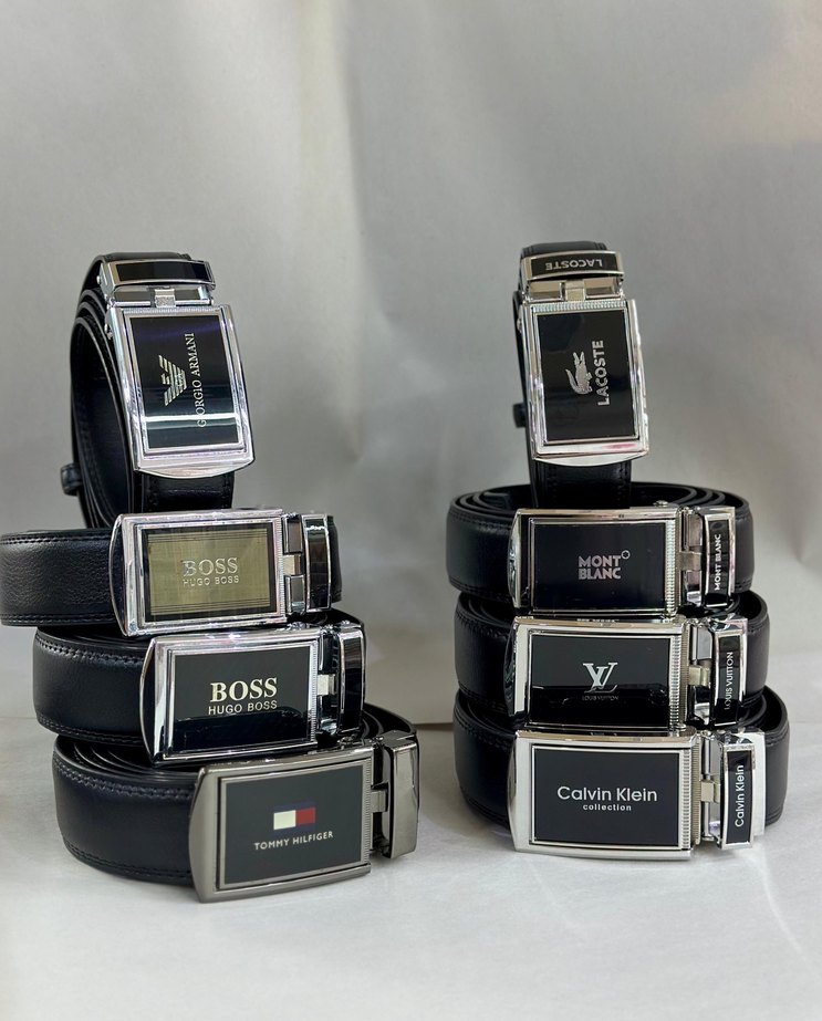 BOSS, Calvin Klein ve Lacoste gibi markaların logosunu taşıyan metal tokalı siyah erkek kemerleri, modern iş stiline uygun.