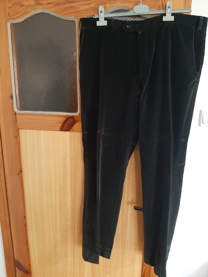 Siyah süet/kadife kumaştan yapılmış, kemerli, normal boy midi uzunluğunda, erkekler için rahat kesim pantolon. Ofis için uygun. Arasında yıpranma mevcut. Başka sorunu yoktur. 54 bedendir.