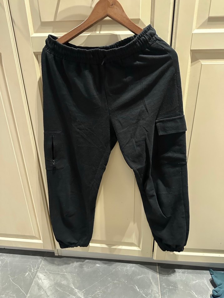 Siyah renkli, kemerli ve rahat kesim erkek eşofman altı. Yumuşak ve sıcak kumaştan üretilmiş, normal boyda ve düz tasarımlıdır. Dış mekan kullanımı için uygundur.