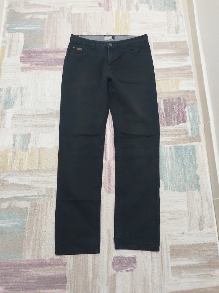 Siyah, kemerli, regular fit erkek denim pantolon. Rahat kesimi ve dayanıklı kumaşıyla günlük sokak stiline uygundur.