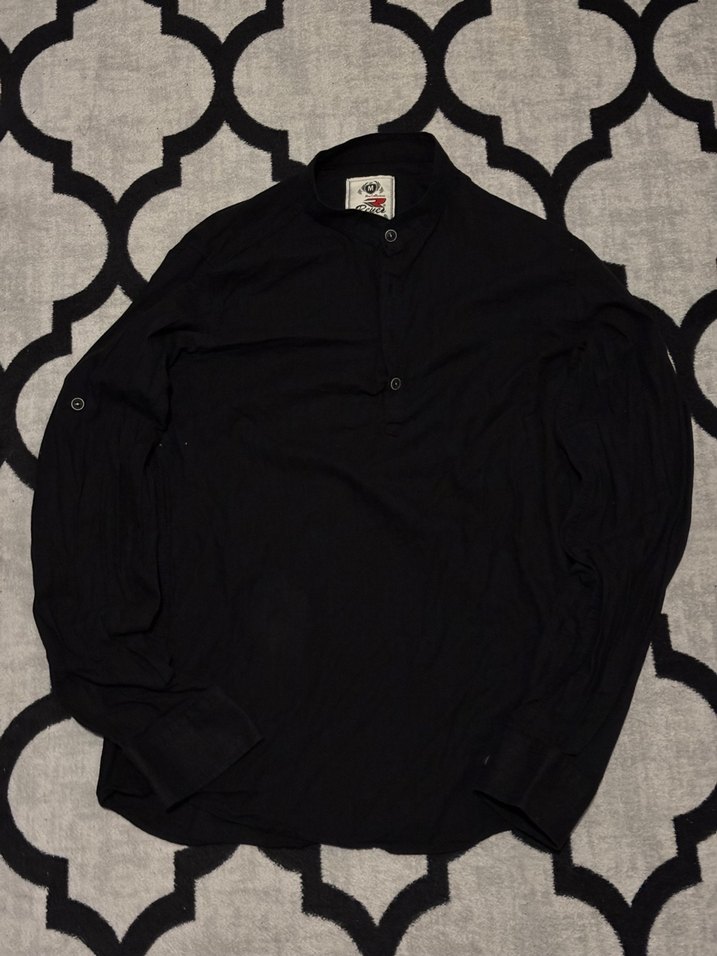 Siyah renkte, keten kumaştan erkek uzun kollu gömlek. Düğmeli, yüksek yakalı ve bol kesim, sade tasarım ile günlük rahat kullanım için uygundur.