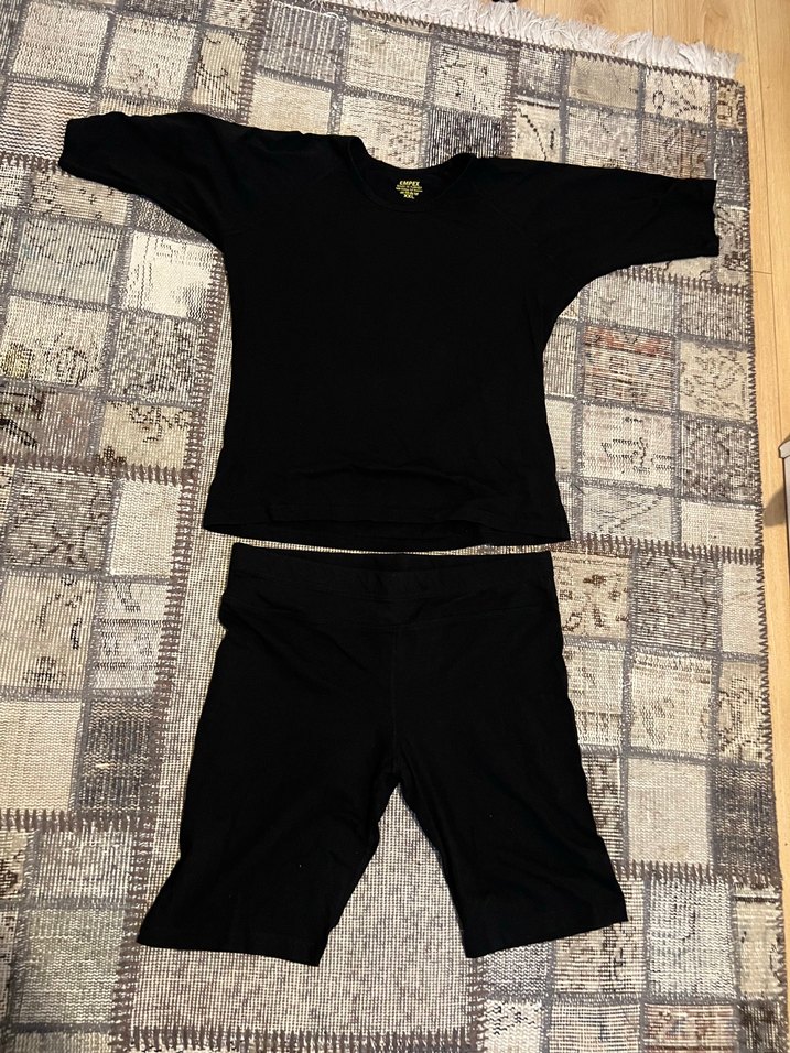 Siyah, kısa kollu, bisiklet yaka üst ve midi boy şortlardan oluşan erkek pijama takımı, sade ve rahat bir şıklık sunar.