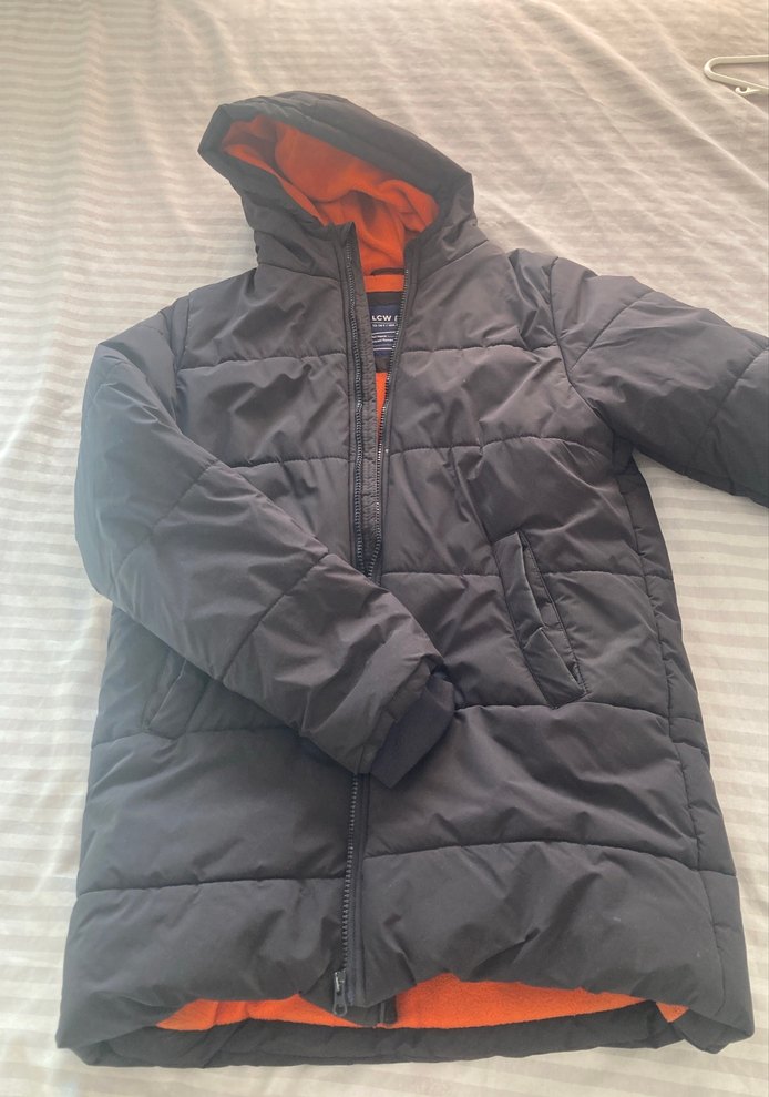 Siyah, kapüşonlu ve fermuarlı erkek kışlık kaban, yüksek yakalı ve uzun kolludur. Rahat ve sıcak tutan iç astarıyla dış mekan için uygundur. Önünde bir yeri yırtılmış orası dikilirse rahatlıkla kullanılabilir. 13-14 yaş