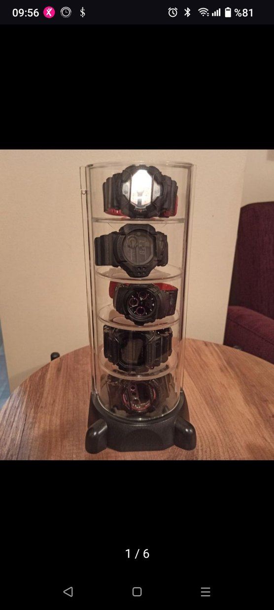 Farklı koyu tasarımlara sahip siyah erkek kol saatleri, şeffaf silindirik bir kutuda dikey olarak sergileniyor. ⌚