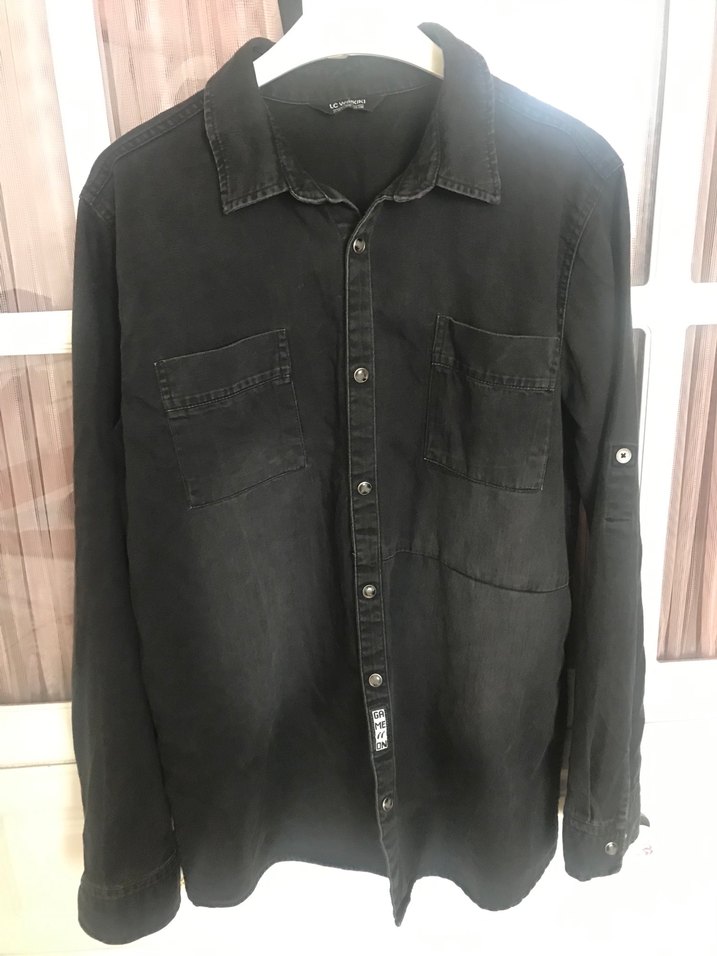 Erkek için uzun kollu, çıt çıt düğmeli siyah kot gömlek. yaka ve bol kesimiyle günlük rahat kullanıma uygundur. Desensiz, midi boyda az giyildi sağlamdır