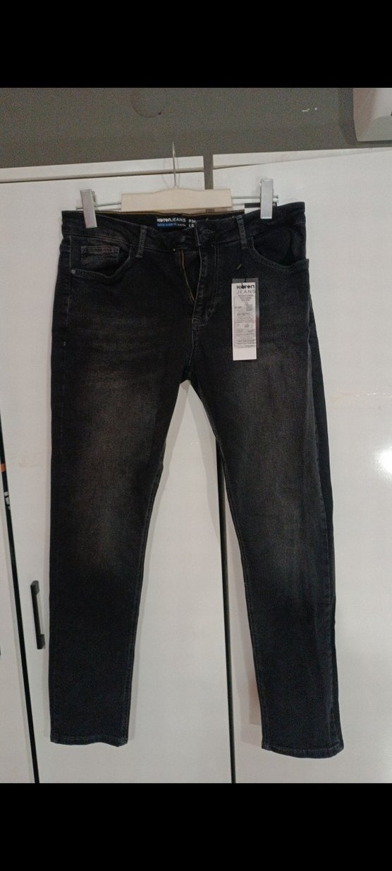 Siyah kot pantolon, düzenli kesim ve normal boyda, kemerli ve sade tasarımlı, günlük kullanım için uygundur.