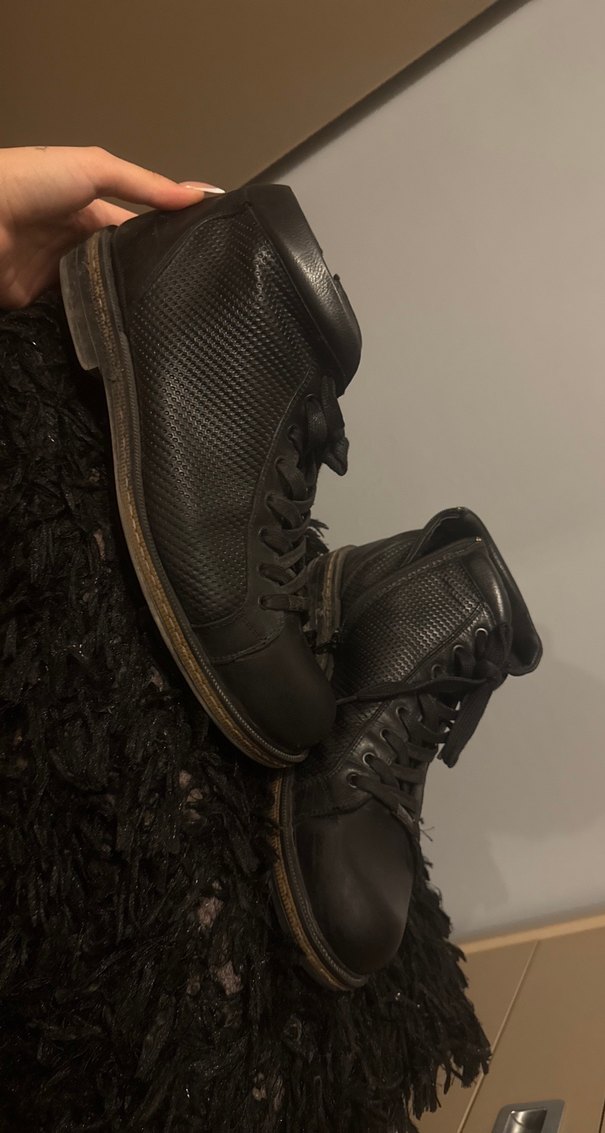 Siyah, kürk detaylı, dokulu yüzeye sahip erkek biker botları, koyu ve desensiz tasarımda iç bilek kısmında kusuru var