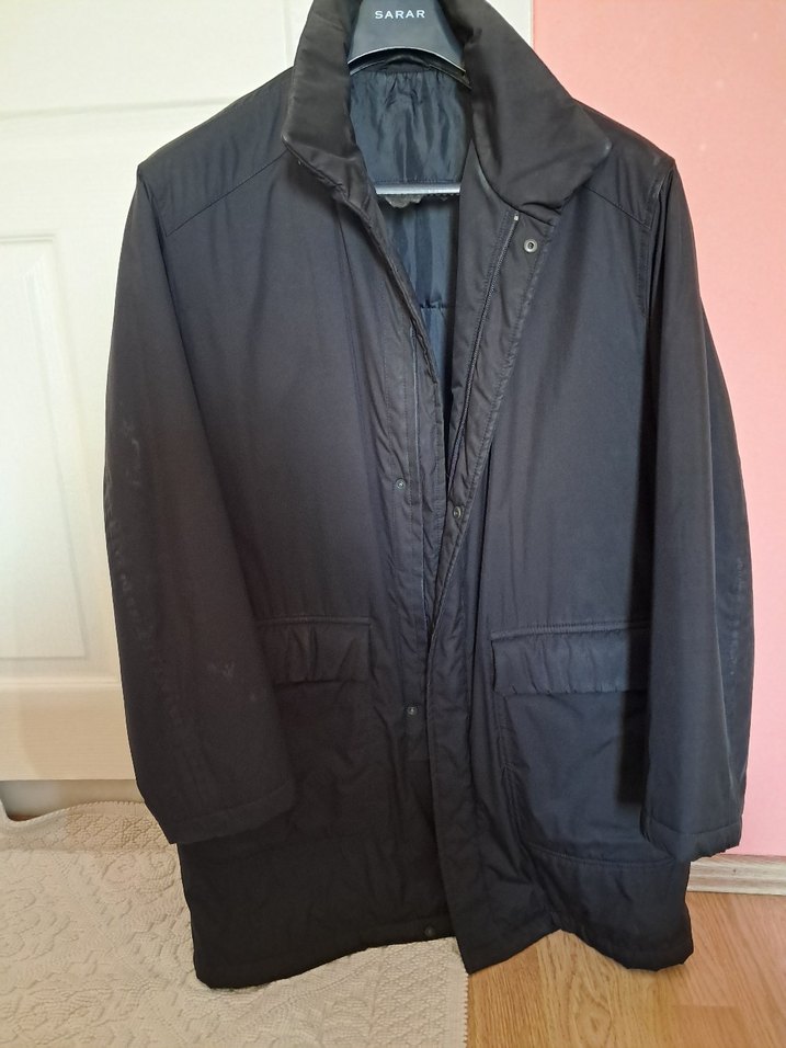 Siyah renkli, düğmeli, normal kesim ve uzun kollu erkek midi boy kaban. Yumuşak ve sıcak kumaştan, günlük ve iş tarzına uygundur.