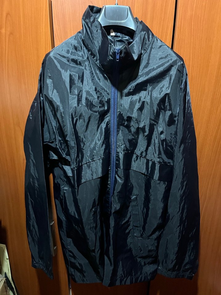 Siyah renkte, fermuarlı önü ve kesik yakası olan erkek yağmurluğu. Sentetik kumaştan, bol kesim ve uzun kollu, sokak stili ve dış mekan için uygun. ️