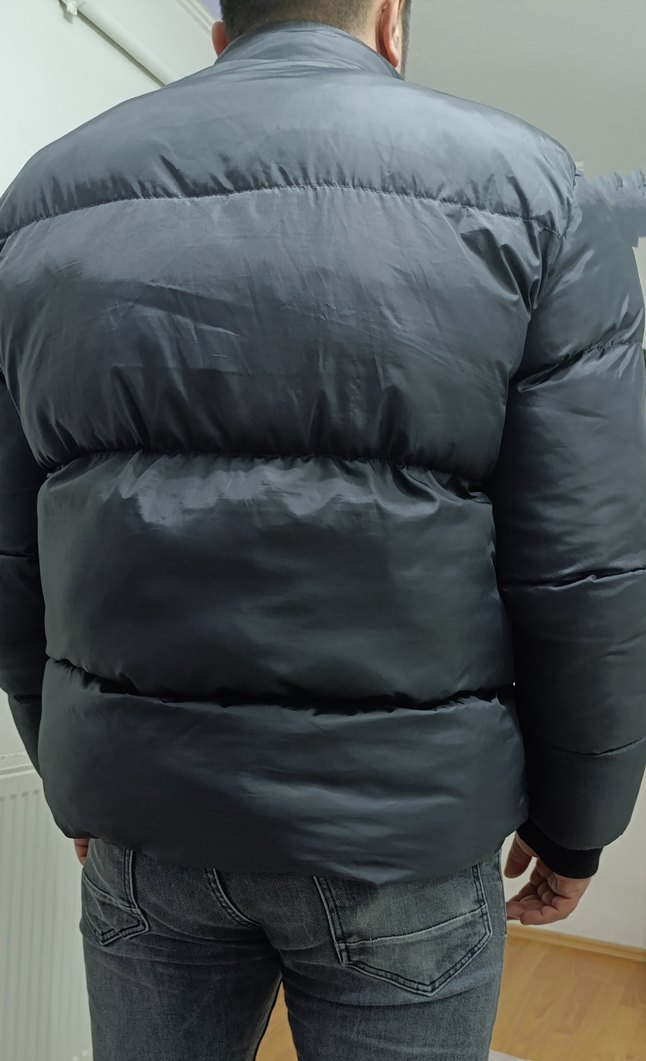 Siyah renkte, kaplumbağa yaka ve uzun kollu erkek mont. Sentetik kumaştan, kemerli ve midi boyda, sokak stili için uygun.