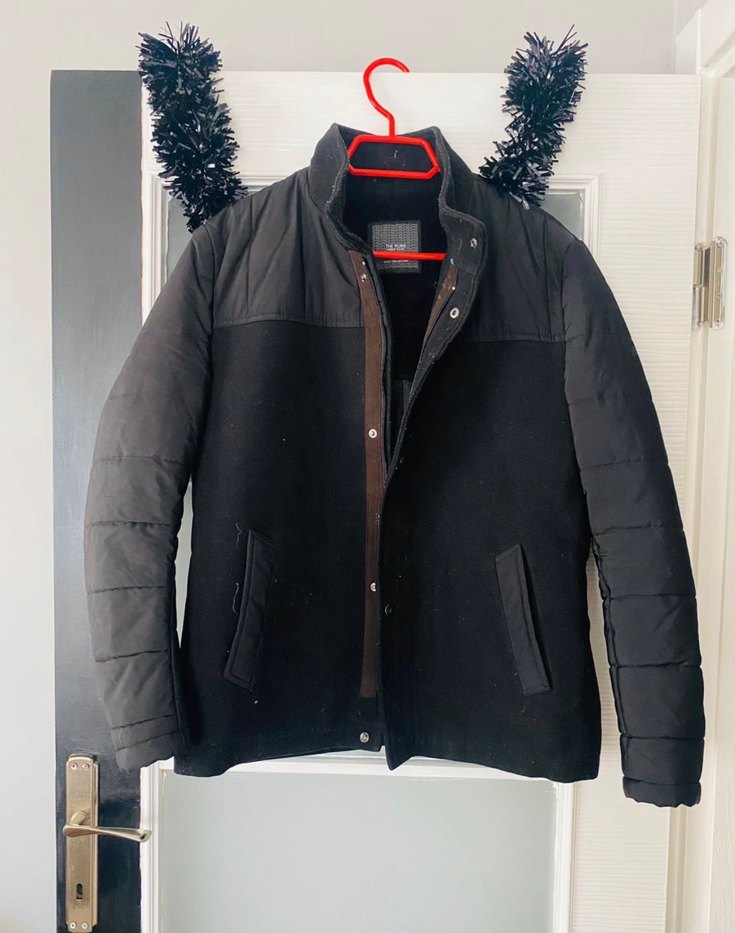 Siyah erkek midi boy kaban, notched lapel ve kürk detaylı, regular fit ve uzun kollu, günlük kullanıma uygun street style tarzında.