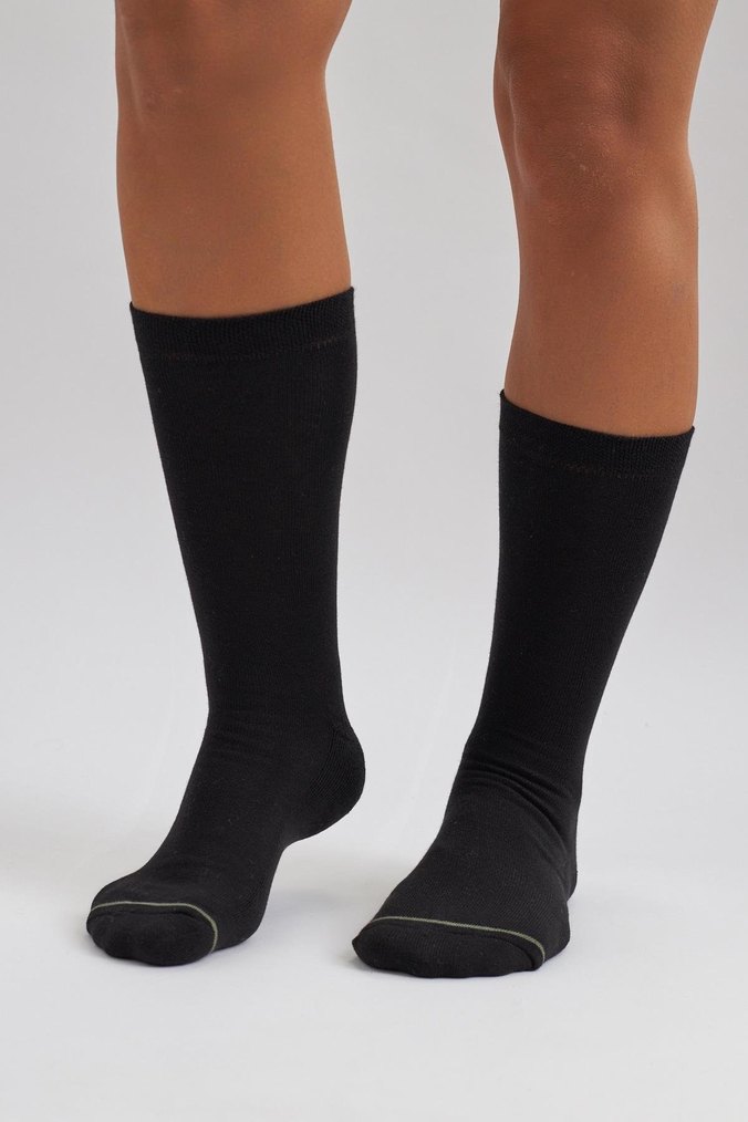 Bu siyah, vücuda oturan midi çoraplar, desen içermeyen rahat bir tasarıma sahiptir. Günlük kullanım için uygun orta uzunluktadır.