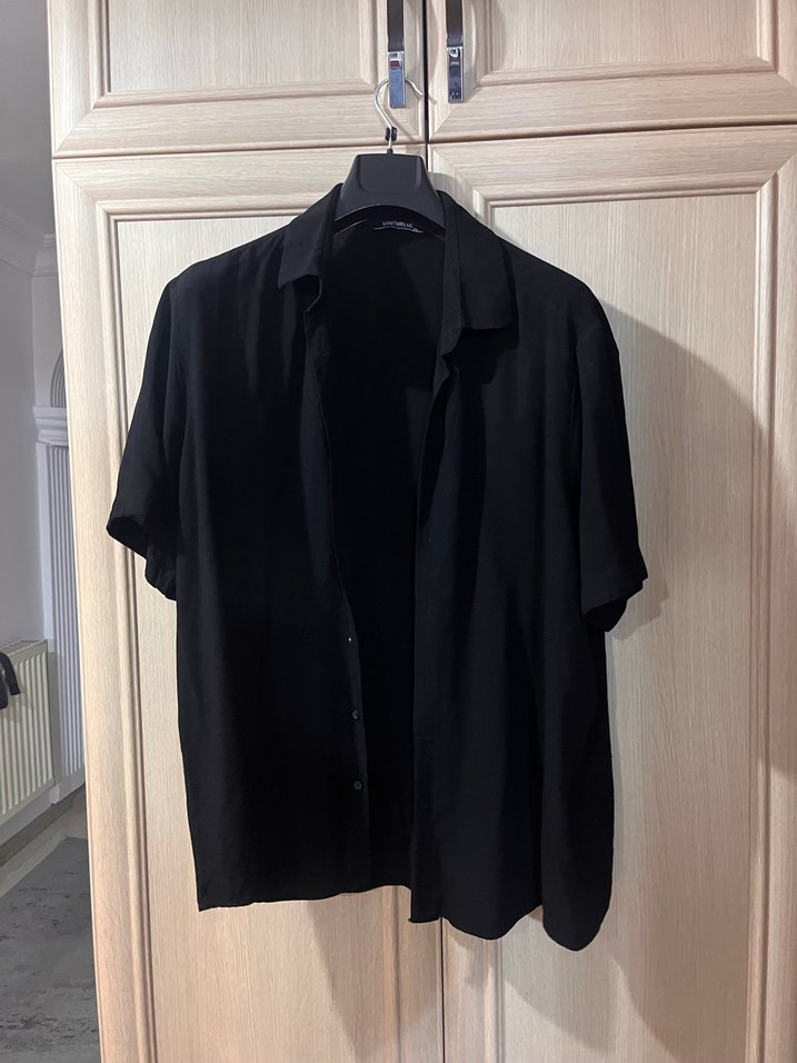 Siyah renk, kısa kollu ve yakalı bu erkek gömleği, midi boyda ve dar kesimdir. İpeksi kumaşıyla günlük kullanım için rahat ve şık bir görünüm sunar. Minimalist ve trend sokak stili için uygundur.