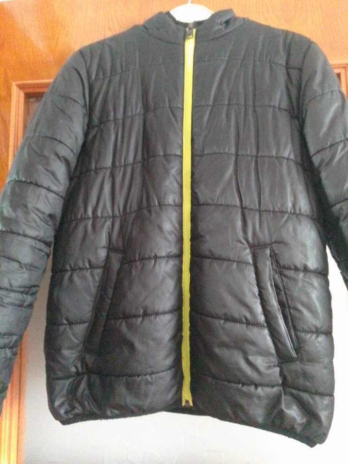 Siyah renkli, fermuarlı, sentetik kumaştan yapılmış erkek midi kışlık mont. Uzun kollu, kesimi vücuda oturan, notched lapel yakalı ve cep detaylıdır. ince ince polar arka kısmında ufak bir deforme vardı ne kadar resim çektim