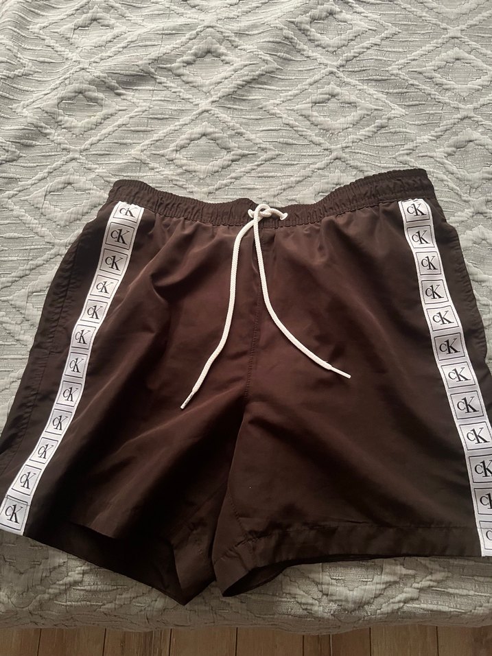 Yanları CK logo şeritli, bol kesim ve kemerli kahverengi erkek midi yüzme şortu. Plaj ve günlük sokak stiline uygun.