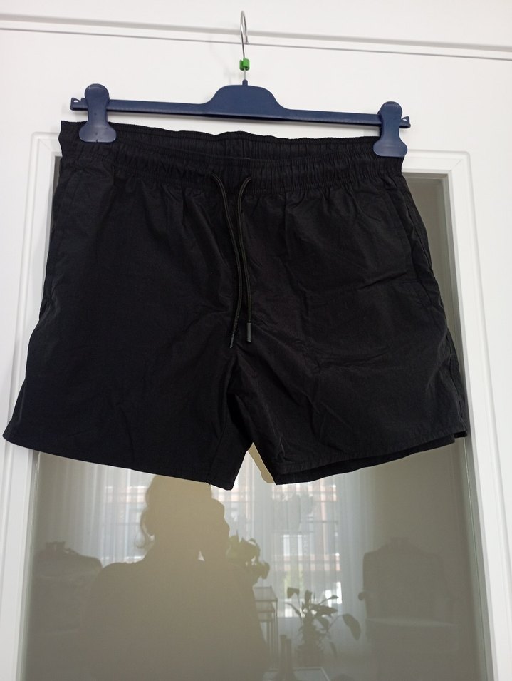 Siyah renkli, bol kesim ve kemerli erkek mini mayo şort, dış mekanda kullanım için uygundur. Düz ve desensiz tasarıma sahiptir.