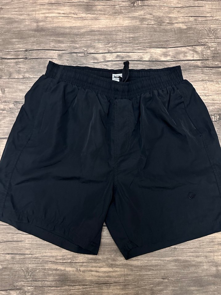 Siyah renkli, bol kesim ve kısa erkek yüzme şortu. Elastik bel bandı ve düz tasarımıyla plaj ve günlük sokak stili için uygundur. ️