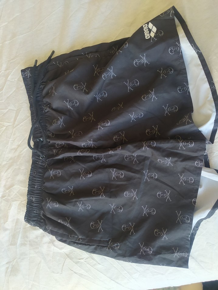 Siyah, gevşek kesim ve tokalı bel bantlı erkek mini yüzme şortu, hafif kafatası desenleriyle. Plaj için athleisure sokak stili uyumlu.