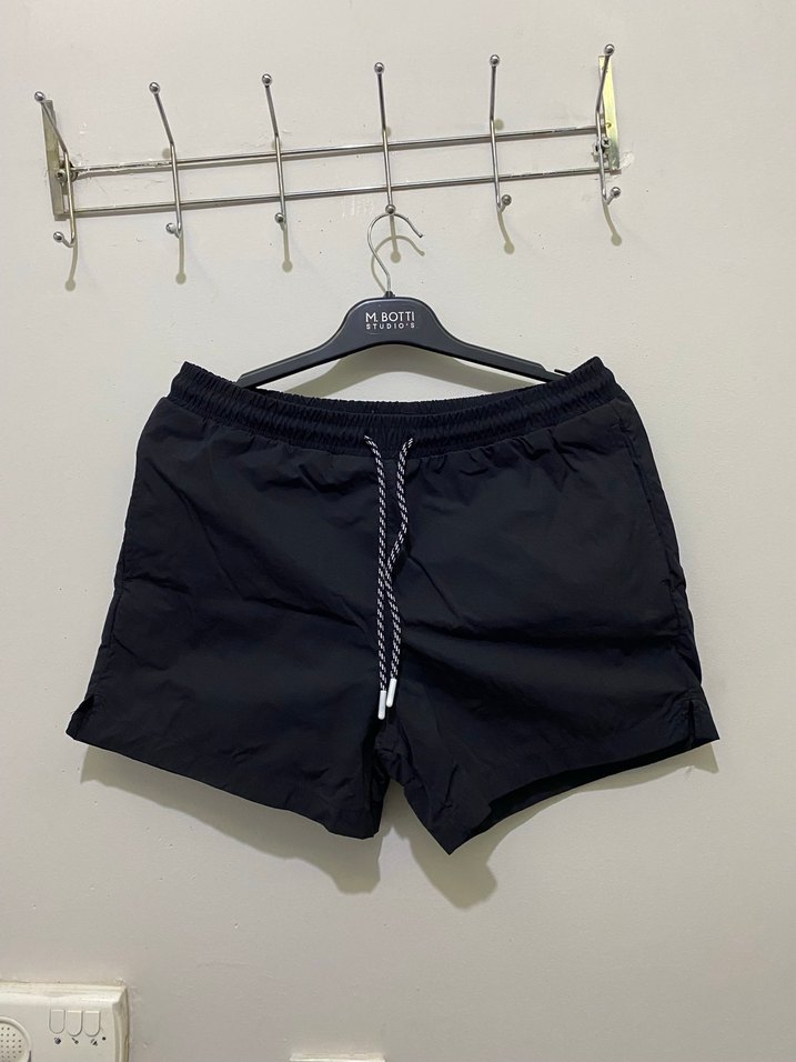 Siyah, bol kesim erkek mini yüzücü şort, elastik bel ve bağcık detaylı. Rahat ve şık görünüm için ideal, dış mekan kullanımı için uygun.