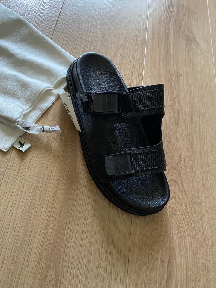 Siyah, tokalı iki ayarlanabilir bantlı, dayanıklı kauçuk malzemeden yapılmış minimalist erkek sandalet. Günlük sokak stili için uygundur.