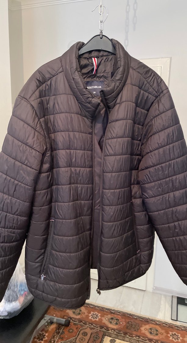 Siyah erkek mont, rahat kesim ve normal midi boyda. Uzun kollu, yumuşak kumaştan, günlük kullanıma uygun.