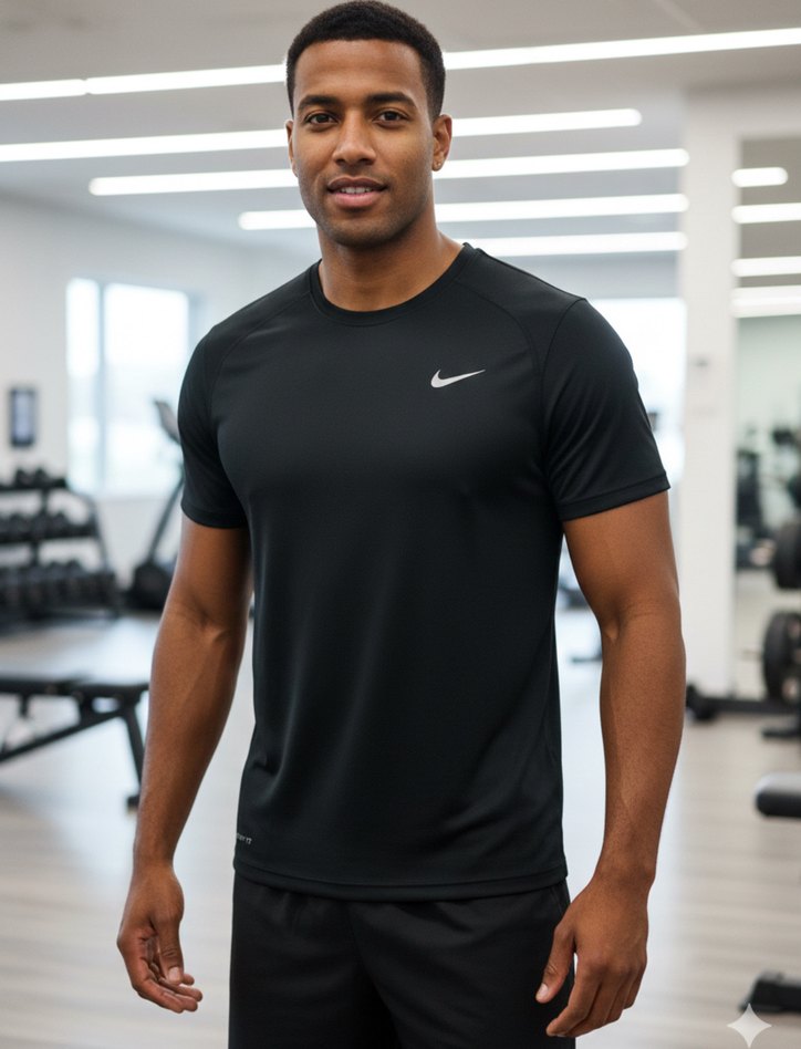Siyah renkli Nike erkek tişört, kısa kollu ve fitted kesimlidir. Sentetik kumaştan üretilmiş, spor ve street wear için uygundur. ♂️