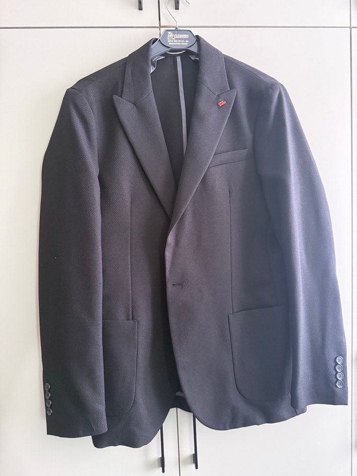 Siyah renkte, klasik kesim ve düğmeli, uzun kollu erkek ceket. Ofis için uygun, desen içermeyen şık tasarım.