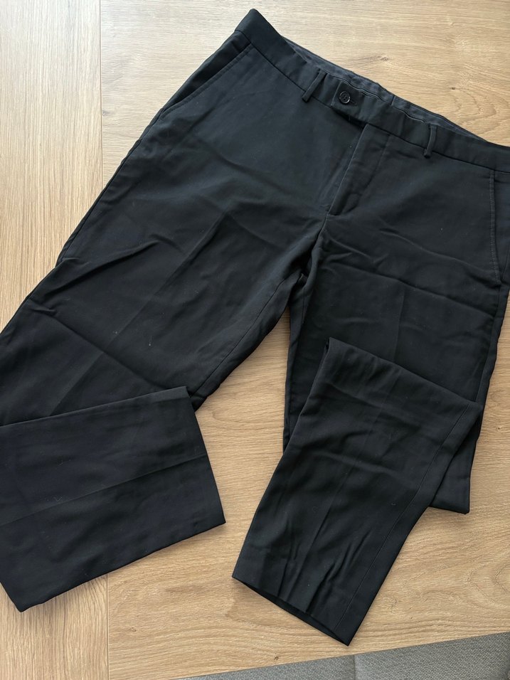 Düz siyah, normal boyda ve regular fit erkek ofis pantolonu. Yumuşak sentetik kumaştan yapılmış, sade ve şık bir tasarıma sahiptir.