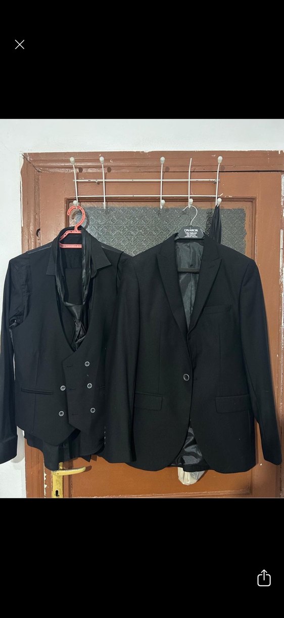 Düğmeli, uzun kollu, sivri yaka siyah erkek takım elbise, normal kesim ve midi boy, ofis için uygun. ️