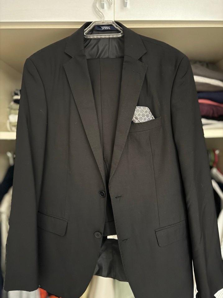 Siyah, klasik şıklıkta ve modern klasik tarzda, düğmeli, normal uzunlukta erkek ofis takım elbisesi. Uzun kollu ve dar kesime sahiptir. ️